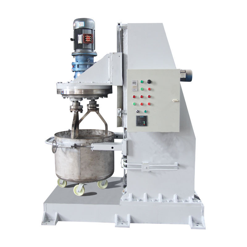 3、料筒:物料在不銹鋼材質(zhì)的料筒內(nèi)進(jìn)行攪拌。料筒裝在升降平臺(tái)上,通過(guò)油缸實(shí)現(xiàn)升降。料筒下部裝有滾輪,可以推進(jìn)。拉出。當(dāng)攪拌器旋轉(zhuǎn)時(shí),料筒由擺線針輪減速機(jī)通過(guò)凸輪和滾輪帶動(dòng)同時(shí)旋轉(zhuǎn),旋轉(zhuǎn)方向可以選擇??刂泼姘迳涎b有變頻調(diào)節(jié)旋鈕,可以根據(jù)工藝要求調(diào)節(jié)旋轉(zhuǎn)速度。